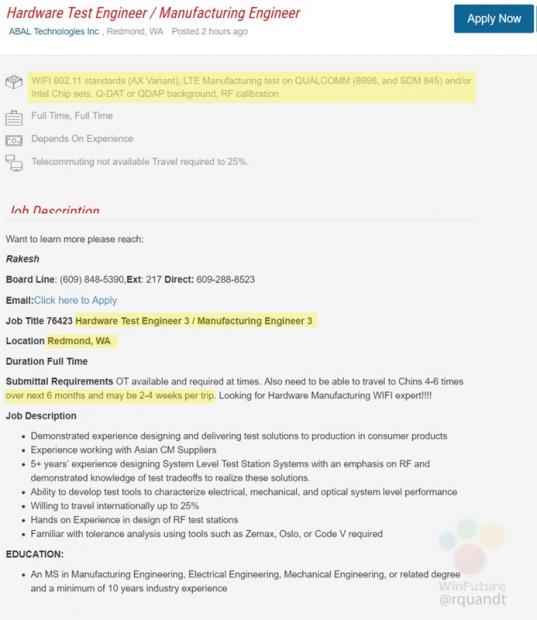 ABAL Technologies còn ghi chú thêm các ứng viên sẽ phải di chuyển đến một nhà máy có tên JDM1 đặt tại Tô Châu, Trung Quốc nhiều lần. Thật trùng hợp khi JDM1 được quản lý bởi Pegatron, một đối tác đang sản xuất các thiết bị Surface cho Microsoft.