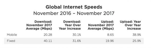 Vào tháng 11, Speedtest ghi nhận 119 quốc gia có tốc độ tải về trên thiết bị di động nhanh hơn mức trung bình toàn cầu là 20.28 Mbps, trong khi 134 nước khác đạt tốc độ chậm hơn. Về băng thông rộng, có 71 quốc gia ghi nhận thông số trên mức trung bình và 185 quốc gia thấp hơn.