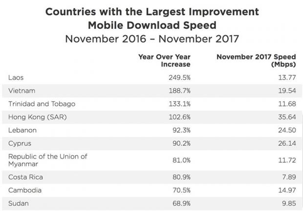 Các quốc gia có sự tăng trưởng tốc độ kết nối internet trên di động ấn tượng nhất là Lào (cao nhất – 249.5%), Việt Nam, Trinidad & Tobago, Hong Kong và Lebanon. Các nước cải thiện băng thông rộng bao gồm Reunion, Guatemala, Ghana, Peru, Ấn Độ và một hòn đảo nhỏ của Pháp ngoài bờ biển Châu Phi.