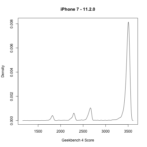 Mẫu iPhone 7 mới hơn có vẻ 'miễn nhiễm' với tình trạng trên tính tới tận những những bản iOS 11 gần đây nhất. Quan sát kết quả benchmark của iPhone 7 với lần lượt từ iOS 10.2, iOS 10.2.1 và iOS 11.1.2 các bạn có thể dễ dàng thấy rằng điểm số benchmark vẫn được duy trì ở xấp xỉ 3500 điểm và gần như không có mẫu nào bị trở thành nạn nhân của tình trạng giảm thiểu hiệu năng CPU.