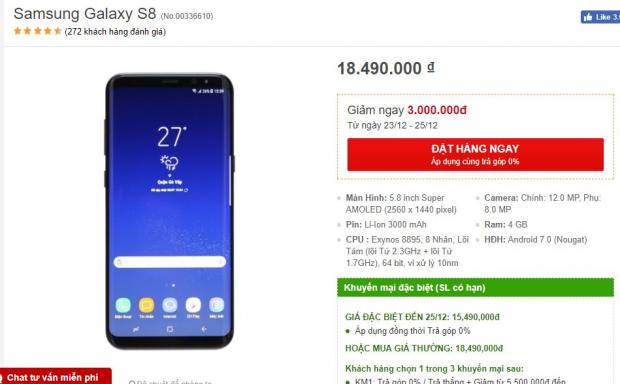 Trong khi Galaxy S8 có mức giảm mạnh nhất, từ 18.49 triệu xuống chỉ còn 15.49 triệu đồng, giảm tới 3 triệu đồng.