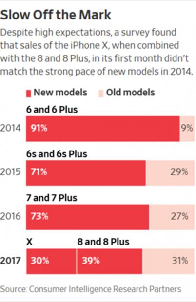 Cụ thể hơn, khi khảo sát người mua iPhone trong tháng kết thúc vào ngày 3/12/2017 cho thấy iPhone X, iPhone 8 và 8 Plus chỉ chiếm 69% trên tổng số lượng smartphone của Apple được bán ra tại Mỹ. Trong khi đó, cùng thời điểm năm 2014 con số này ở iPhone 6 và 6 Plus lên đến 91%.