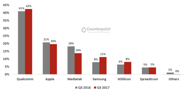 Trong quý vừa qua, Qualcomm dẫn đầu thị trường với 42% thị phần (xét về doanh thu), tăng 1% so với cùng kỳ năm ngoái trong khi Apple là 20%, giảm 1%, MediaTek ở vị trí thứ 3 với 14%, giảm từ 18% cùng kỳ năm ngoái.