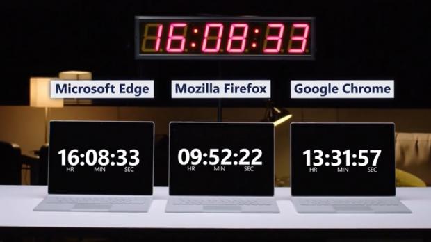 Ở video đầu tiên, hãng phát video bằng 3 chiếc Surface Book chạy Windows 10 Fall Creators Update trên 3 trình duyệt khác nhau. Kết quả là thiết bị dùng Edge có thời gian xem phim lâu nhất – 16 giờ 8 phút, nhiều hơn 63% so với Mozilla Firefox (9 giờ 52 phút) và 19% so với Google Chrome (13 giờ 31 phút).
