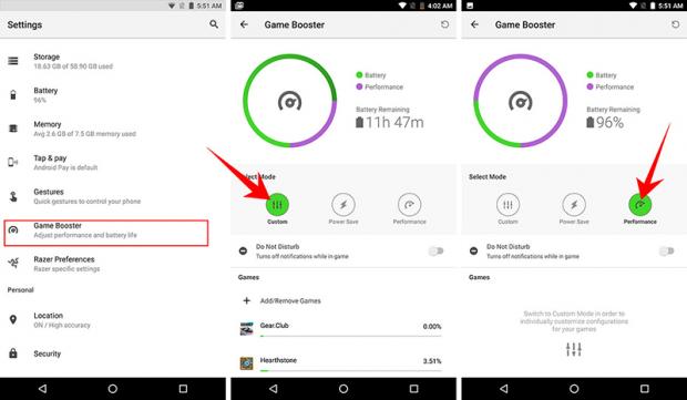 “Battery Saver” có thể coi như một công tắc chuyển đổi giữa hoặc có tất cả, hoặc không có gì. Trong khi đó, Razer Phone được trang bị tính năng gọi là “Game Booster” cho phép kiểm soát chi tiết hiệu suất và công nghệ màn hình ở từng ứng dụng riêng biệt.