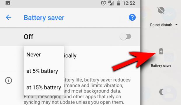 Google Pixel sở hữu nút bật tắt trong menu mang tên “Battery Saver” (ảnh trên) với chức năng như sau: Giảm hiệu suất của thiết bị, giới hạn chế độ rung, dịch vụ định vị và hầu hết dữ liệu nền; email, tin nhắn và các ứng dụng khác dựa vào tính năng đồng bộ có thể không cập nhật thông tin trừ khi bạn mở chúng.