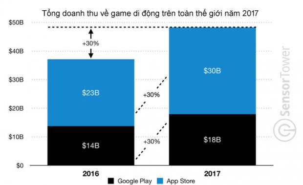 Theo SensorTower, tổng doanh thu của App Store và Google Play trong năm 2017 đã tăng tới 35% so với năm 2016.