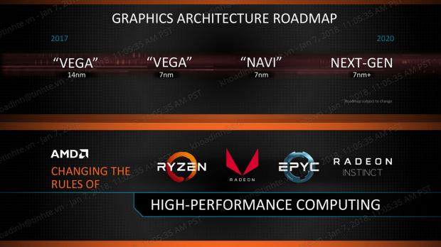 Tương tự lộ trình kiến trúc vi xử lý đồ họa sẽ tiếp tục từ Vega 14 nm 2017, năm nay tiếp tục là Vega nhưng thu nhỏ kích thước đế chip và năm 2019 sẽ là Navi 7 nm, 2020 sẽ có thế hệ 7 nm+. Một điều thú vị là Navi đã được thiết kế gần hoàn chỉnh và AMD đang bắt đầu với thế hệ tiếp theo.