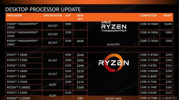 Thông tin hấp dẫn cuối cùng liên quan đến Ryzen cho desktop là AMD sẽ giảm giá cho một loạt các phiên bản từ thấp đến cao. Mức giá giảm nhiều nhất đến $150 trên Ryzen 7 1800X, giảm $100 trên Ryzen Theadripper 1900X. Các phiên bản Ryzen còn lại giảm từ $30 đến $50. Sự điều chỉnh này khiến giá chip của AMD cạnh tranh tốt hơn với dòng Coffee Lake-S của Intel cũng như dọn đường cho Ryzen 2 ra mắt vào tháng 4.