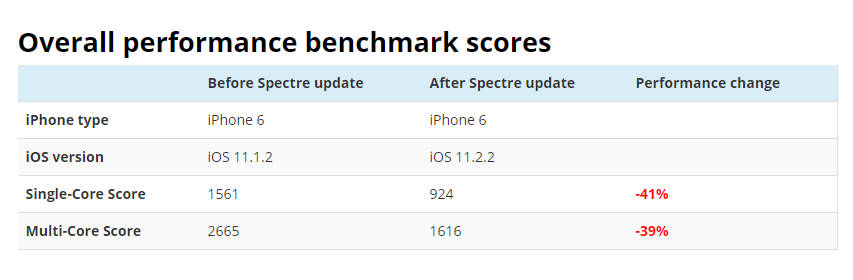 Phiên bản iOS 11.2.2 ra mắt với mục đích chính là hạn chế ảnh hưởng từ lỗi bảo mật Spectre. Sau khi ra mắt, nhiều người dùng đã phản ánh rằng phiên bản này làm giảm hiệu năng của máy. Một số người dùng đã thử nghiệm trên iPhone 6s và iPhone 5s cho thấy rằng hiệu năng không giảm. Nhưng với bài thử nghiệm kỹ hơn từ Melvin của trang melv1n.com cho thấy rằng, hiệu năng thực sự có giảm.