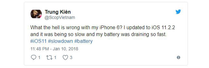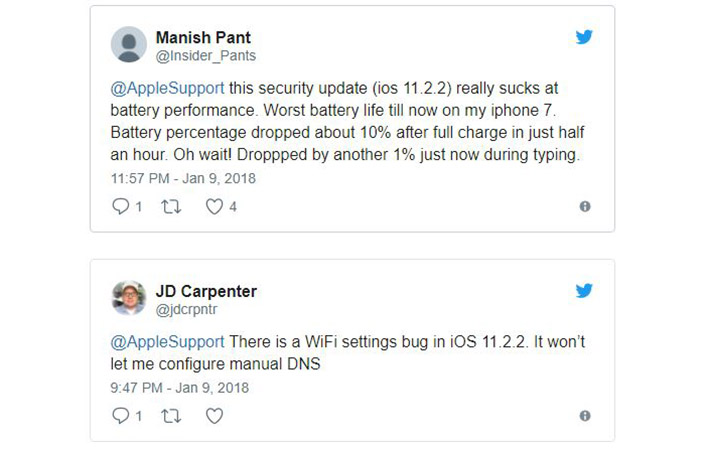 Ngoài ra, còn một số trường hợp nhỏ cho rằng việc nâng cấp iOS 11.2.2 làm iPhone, iPad của họ bị hao pin, gặp tình trạng khởi động lại ngẫu nhiên cùng với những vấn đề về cảm ứng, Siri hoặc xung đột với ứng dụng bên thứ 3.