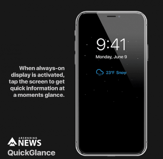 Cuối cùng, ý tưởng iOS 12 còn mang lại tính năng màn hình luôn bật với chức năng tương tự màn hình Always On trên các điện thoại Android giúp các iFan có thể dễ dàng xem thông báo, giờ và thậm chí là thời tiết mà không cần bật sáng màn hình.