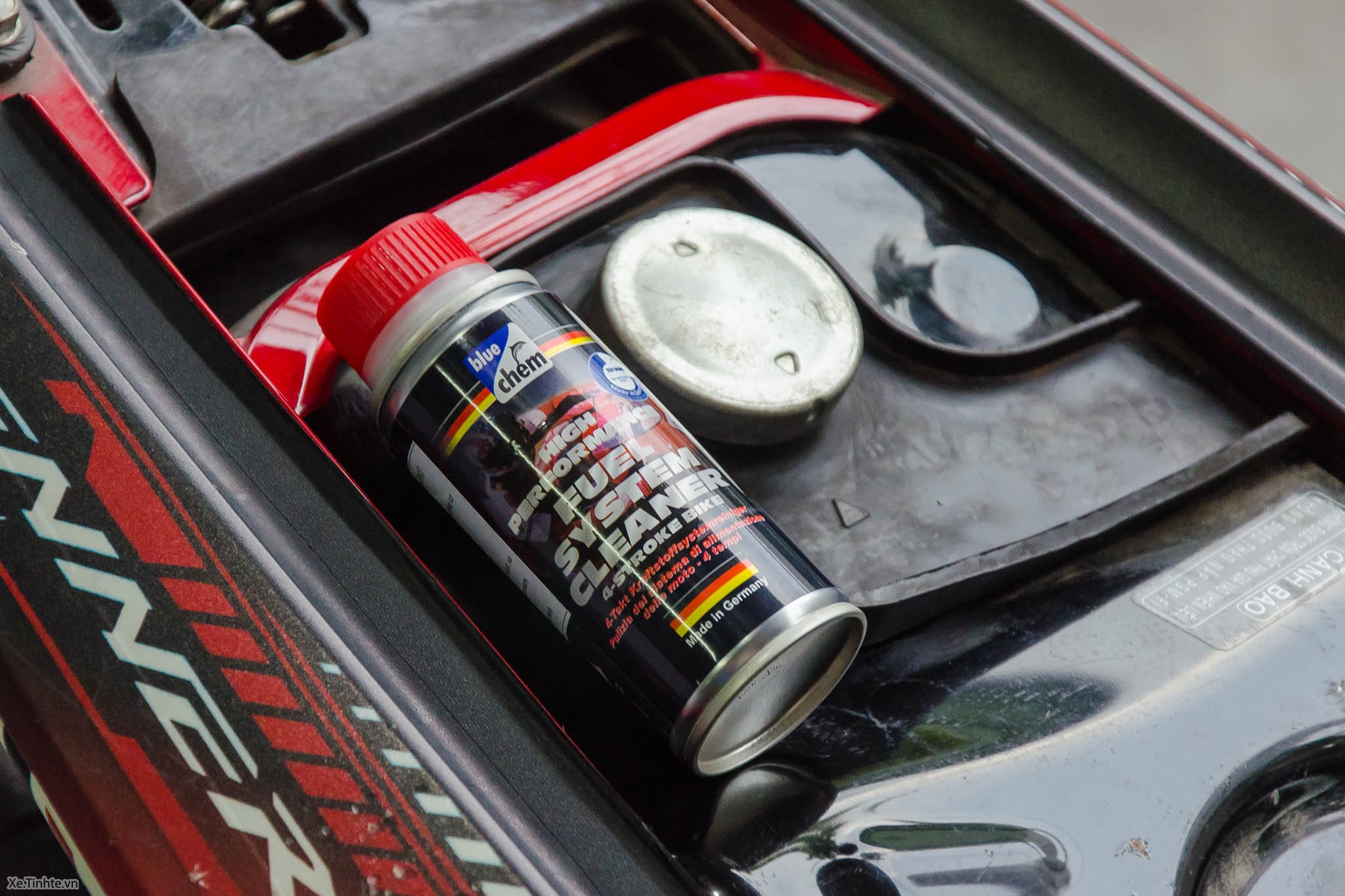 Như ở đây mình sử dụng dung dịch Fuel System Cleaner (FSC) “2 trong 1” của hàng BlueChem để xử lý cùng lúc hai vấn đề này. Các sử dụng hết sức đơn giản: đổ trực tiếp vào bình xăng xe máy với tỷ lệ 50 ml/6 lít xăng.