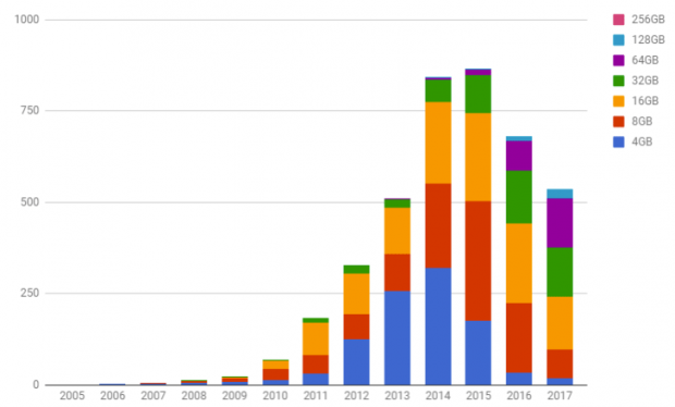 Theo biểu đồ bên dưới có thể thấy, bộ nhớ ROM bắt đầu phát triển mạnh mẽ nhất ở năm 2010 với sự phân chia rõ rệt 3 bộ nhớ trong phổ biến lúc đó là 4 GB, 8 GB và 16 GB.