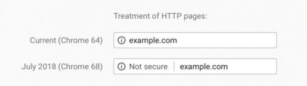 Bắt đầu từ tháng 7 năm 2018, khi phiên bản Chrome 68 được ra mắt và trở nên ổn định hơn, tất cả các trang web sử dụng giao thức HTTP sẽ bị thêm từ Not secure (không an toàn) như hình dưới để người dùng nhận biết và cẩn thận hơn. Ngoài ra, Google còn cung cấp một số hướng dẫn thiết lập và giải thích các vấn đề liên quan đến bảo mật cho các nhà quản trị web chưa chuyển đổi sang giao thức HTTPS.