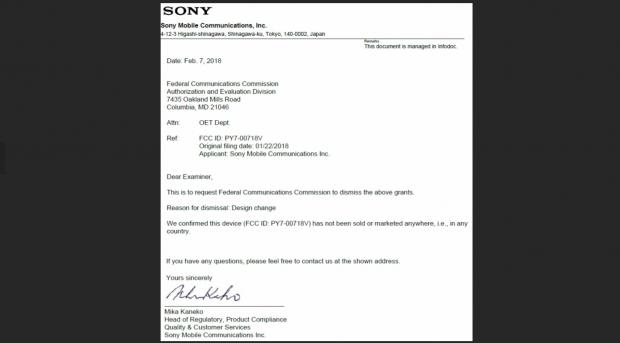 Trong đơn gửi đến FCC (Uỷ ban Truyền thông Liên bang Mỹ), Sony Moblie đã yêu cầu được huỷ một trong những chi tiết trong bản đăng ký trước đây, đó chính là “thiết kế”. Một thiết bị được cấp phép bởi FCC mà vẫn chưa bán hoặc quảng cáo thì việc thay đổi sẽ không gặp trở ngại gì.