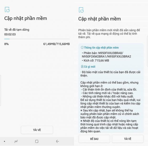 Hiện tại, bản cập nhật mới này đã có ở thị trường Việt Nam khi mà các thiết bị Galaxy Note 8 của người dùng đã bắt đầu nhận được thông báo nâng cấp phần mềm qua đường OTA. Tuy nhiên, nếu không nhận được thông báo này thì các bạn cũng có thể tự kiểm tra bản cập nhật bằng cách truy cập vào Cài đặt > Cập nhật phần mềm > Tải về bản cập nhật thủ công. Được biết, bản cập nhật mới này đi kèm với phần mềm xây dựng N950FXXU3BRA8/ N950FOXM2BRA1/ N950FXXU3BRA2. Số phiên bản sẽ có sự khác biệt tùy theo khu vực nhận được bản cập nhật và dung lượng tải về khoảng 715.66MB, khá lớn nên lời khuyên là bạn hãy sử dụng mạng Wifi để tải bản cập nhật này.Được biết, bản cập nhật mới dành cho Galaxy Note 8 sẽ cải thiện tính ổn định của thiết bị, sửa lỗi và đi kèm với bản vá lỗi bảo mật Android tháng 2 của Google.