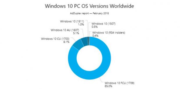 Theo thống kê mới được công bố đến từ AdDuplex, số lượng người dùng đã cập nhật Fall Creators Update (version 1709) chiếm khoảng 85%. Đây là một con số khá ấn tượng, bởi vì phiên bản này chỉ mới được phát hành trong 4 tháng.