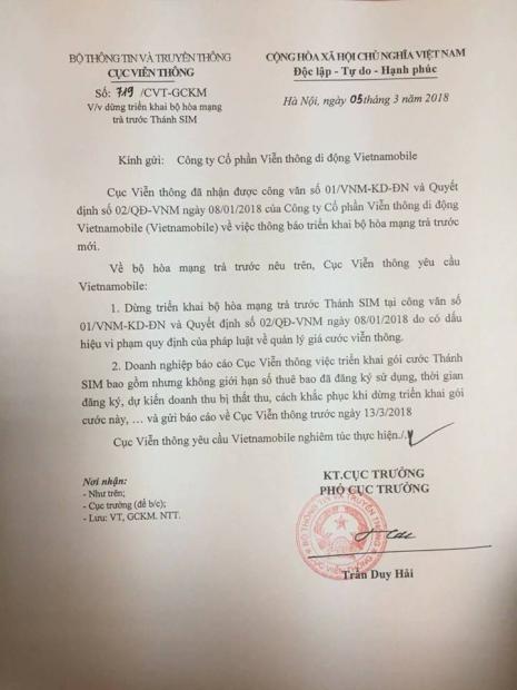 Theo Cục Viễn thông thì 'Thánh SIM' của Vietnamobile có dấu hiệu vi phạm quy định của pháp luật về quản lý giá cước viễn thông. Ngoài ra Cục cũng yêu cầu Vietnamobile thống kê danh sách các thuê bao đã hòa mạng, dự kiến doanh thu bị thất thu và cách khắc phục khi dừng triển khai gói cước này....