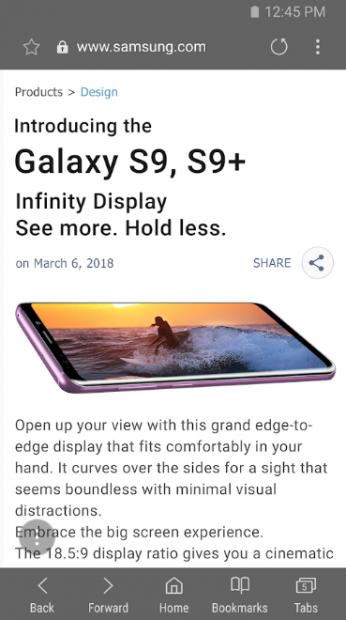 Phiên bản mới nhất sử dụng engine Chromium M59, mang đến tốc độ duyệt web rất nhanh và cải tiến hình ảnh khi chơi game online. Bên cạnh đó, trình duyệt của Samsung còn có tính năng bảo vệ người dùng khi lướt web (protected browsing), tính năng này sẽ thông báo mỗi khi có trang web muốn thu thập dữ liệu cá nhân hoặc lén cài malware, hơn nữa, việc chuyển đổi tab cũng được tuỳ chỉnh lại và ứng dụng đã tương thích tốt hơn với những máy cấu hình thấp, có 1GB RAM hoặc ít hơn.