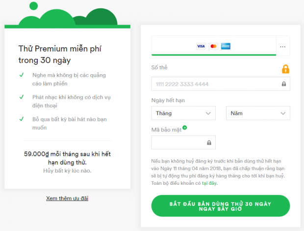 Ngoài dịch vụ nghe nhạc miễn phí Spotify còn giới thiệu dịch vụ Premium có giá 59.000đ mỗi tháng. Đây được coi là một mức giá khá phải chăng và có phần ưu ái thị trường Việt Nam của hãng khi thấp hơn rất nhiều so với $9.99 (tương đương 227.000đ) tại thị trường Mỹ. Với tài khoản Premium bạn sẽ có cho mình khả năng tải và nghe nhạc chất lượng cao, bỏ qua bất kì bài hát nào bạn không thích và hiển nhiên bao gồm cả việc loại bỏ hoàn toàn quảng cáo trong ứng dụng. Nếu muốn bạn cũng có thể dùng thử 30 ngày Premium hoàn toàn miễn phí rồi quyết định có mua nó hay không.