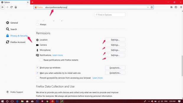 - Firefox 59 đã bổ sung thêm một số tùy chọn bảo mật cho phép bạn quản lý các yêu cầu truy cập Camera, Microphone, Location (vị trí) cũng như Notification (thông báo). Bạn có thể vào Privacy Options hoặc gõ link sau để truy cập và tùy chỉnh: аbout:preferences#privacy