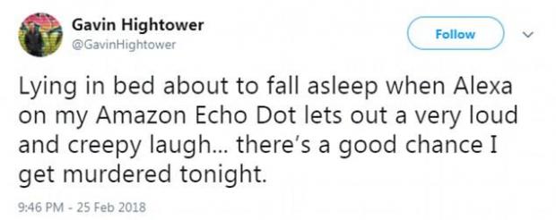 “Đang nằm trên giường chuẩn bị đi ngủ thì Alexa trên chiếc loa Amazon Echo Dot tự dưng phát ra tiếng cười to và ghê rợn… Có khi tối nay tôi bị giết mất thôi.”