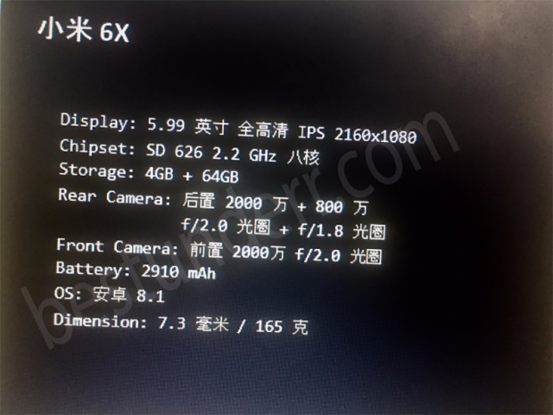 Theo trang Gizchina cho biết, mới đây một hình ảnh chứa thông tin cấu hình gần như đầy đủ về smartphone tầm trung của Xiaomi là Mi 6X hay còn gọi là Mi A2 vừa được đăng tải trên mạng. Theo hình ảnh rò rỉ cho thấy mẫu điện thoại tầm trung sắp tới của Xiaomi sẽ được trang bị màn hình kích thước 5.99 inch, độ phân giải Full HD+ (2160x1080 pixel) với màn hình tỷ lệ 18:9.
