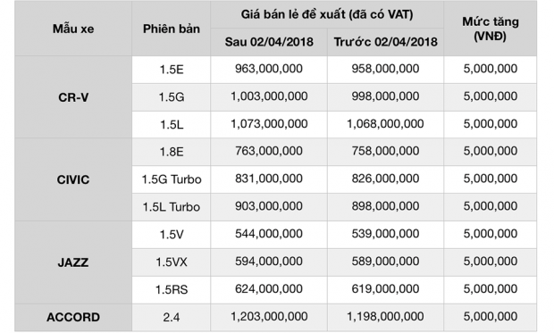 Sau đợt công bố giá bán đầu tháng 3, Honda Việt Nam tiếp tục cập nhật giá bán áp dụng cho các xe nhập khẩu tại Việt Nam. Qua đó dòng xe bao gồm CR-V, Civic, Jazz và Accord có giá bán tăng 5 triệu đồng áp dụng cho mọi phiên bản. Mức giá mới sẽ được áp dụng từ ngày 02/04/2018, trong khi các khách hàng đã đăng ký mua xe theo chương trình ưu đãi trước đó sẽ không bị ảnh hưởng.