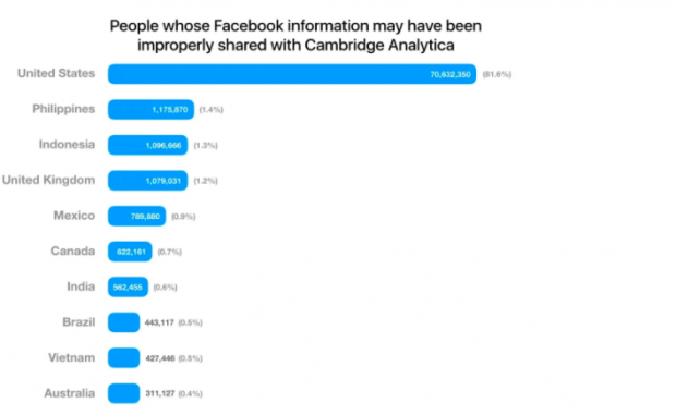 Công ty cho biết ước tính một số dữ liệu của 1,75 triệu người sử dụng Facebook tại Philippines được thu thập và truyền cho Cambridge Analytica, khiến cho nước này trở thành nước đứng thứ hai sau Hoa Kỳ.
