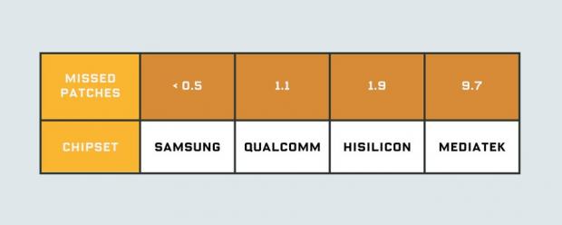 Một thống kê khác cũng đáng được lưu tâm là những thiết bị với vi xử lý MediaTek có tỷ lệ bị 'bỏ rơi' khỏi các bản vá bảo mật cao hơn nhiều so với các thiết bị sử dụng vi xử lý của Samsung và Qualcomm.