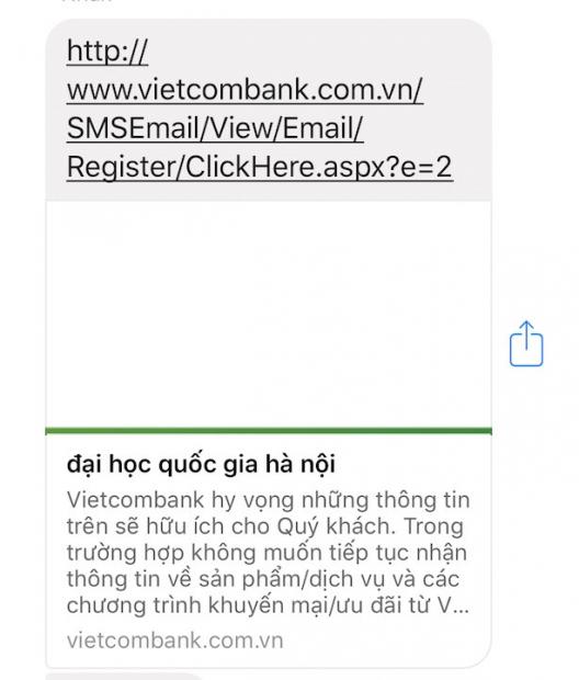 Cụ thể, trang web Vietcombank gặp sự cố ở trang con khi đăng ký email liên kết với tài khoản ngân hàng. Trong lúc đó, các mục khác vẫn hoạt động bình thường. Thông tin mô tả trên ảnh bìa của trang con này hiển thị 'Đại học Quốc gia Hà Nội' khi được chia sẻ qua Facebook.