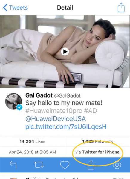 Để quảng bá cho chiếc siêu phẩm này, nữ diễn viên Gal Gadot đã đăng tải trên Twitter cá nhân một bức hình của mình với chiếc Mate 10 với nội dung: 'Say hello to my new mate'. Tuy nhiên, điều buồn cười ở đây không phải ở bức ảnh hay dòng tweet mà chính là ở thiết bị mà cô ấy dùng để đăng tải bức hình này. Vâng, dòng tweet được đăng tải bởi một chiếc iPhone.