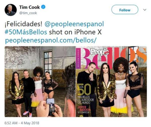 Trang tạp chí này đến từ Tây Ban Nha và có tên là People en Espanol. Số báo mới nhất của họ có tiêu đề là 50 người đẹp của năm 2018. Điều đặc đặc biệt ở cuốn tạp chí này chính là chân dung của 50 người đẹp nhất này và trang bìa của cuốn tạp chí điều được chụp bằng camera trên chiếc iPhone X. People en Espanol cũng nói rằng chất lượng ảnh chụp từ iPhone X rất tốt và đủ để đưa vào tạp chí.