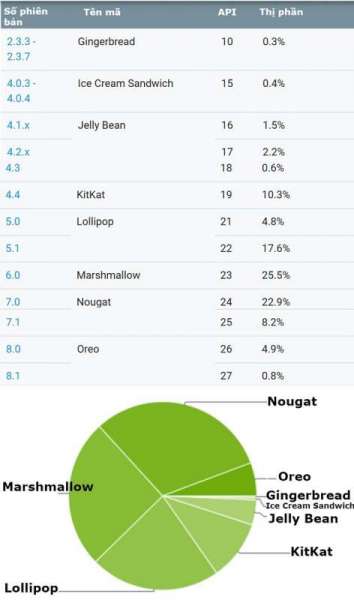 Android Oreo bao gồm phiên bản Android 8.0 và 8.1, nếu gộp chung mà tính thì đạt 5.7% thị phần, tăng 1.1% chỉ trong một tháng. Còn Android Nougat (Android 7.0 và 7.1) hiện chiếm 31.1% thị phần, với mức tăng 30.8% tính từ tháng 4 và có thể được xem là mức tăng trưởng ổn định.