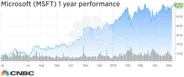 Sự phát triển của Microsoft được thúc đẩy bởi doanh nghiệp điện toán đám mây, cạnh tranh với cơ sở hạ tầng đám mây cung cấp dịch vụ web của Amazon. Cổ phiếu của Microsoft đã tăng gần 40% trong 12 tháng qua.