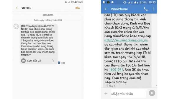 Viettel: [TB] Theo nghị định 49/2017/ND-CP của Chính phủ, thông tin thuê bao di động phải chính xác. Từ ngày 18/5, Viettell sẽ nhắn tin thông báo 5 lần, sau 15 ngày kể từ ngày nhận được thông báo lần đầu tiên, nếu thuê bao chưa bổ sung thông tin sẽ bị chặn 1 chiều. Để đảm bảo quyền lợi, quý khách đăng nhập MyViettel để bổ sung thông tin...