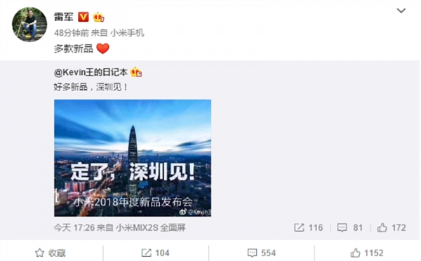 Mới đây, Xiaomi công bố rằng công ty sẽ tổ chức một hội nghị ở Thâm Quyến vào cuối tháng 5, nơi Xiaomi dự kiến sẽ công bố Xiaomi Mi 8. Lei Jun, Giám đốc điều hành của Xiaomi đã tiết lộ rằng bên cạnh Mi 8, một số sản phẩm khác cũng sẽ được công bố tại sự kiện này.