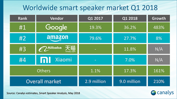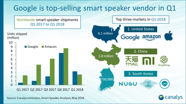 Loa thông minh tiếp tục là phân khúc công nghệ tiêu dùng tăng trưởng nhanh nhất thế giới, với mức tăng trưởng hàng năm trong quý 1/2018 là 210%, các lô hàng đạt đến con số 9 triệu chiếc. Theo kết quả thống kê mới nhất từ Canalys, Google đã đánh bại Amazon và chiếm vị trí dẫn đầu trong thị trường này.