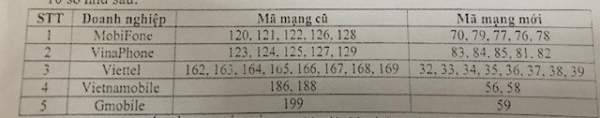 Theo đó các đầu số 11 số của các nhà mạng sẽ được chuyển đổi về đầu số 10 số cụ thể như sau: