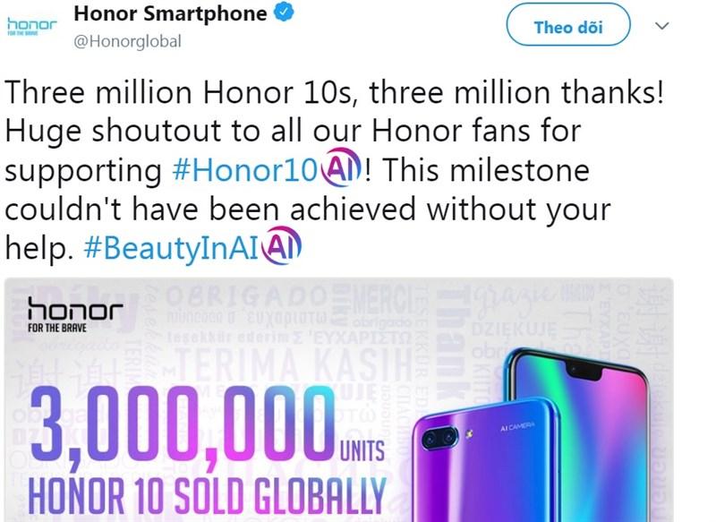 Kể từ khi ra mắt vào tháng 5, Honor 10 rất được lòng người tiêu dùng ở thị trường châu Âu và châu Á. Minh chứng là chỉ vỏn vẹn trong 2 tháng, hãng này đã bán được hơn 3 triệu chiếc Honor 10, đây được xem là một sự phát triển bùng nổ về mặt thương hiệu.