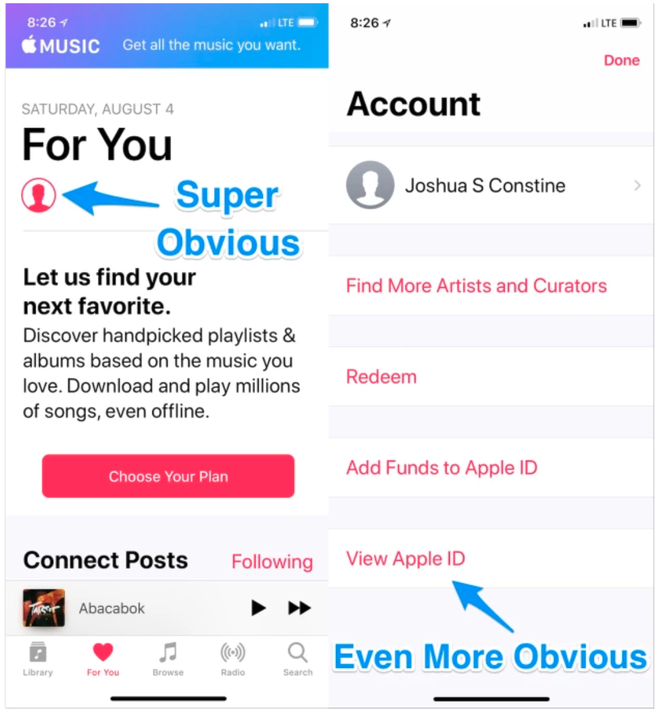 Bạn muốn huỷ đăng ký Apple Music hay các dịch vụ mà bạn đăng ký dùng thử miễn phí ư? Dễ LẮM. Trước hết, hãy ấn vào hình vòng tròn mà hoàn toàn không có nhãn, biểu tượng cho hình ảnh tiểu sử. Lẽ ra bạn sẽ phải thấy tuỳ chọn 'Quản lý đăng ký'... nhưng bạn sẽ chưa thấy ngay đâu. Thay vào đó, bạn sẽ phải ấn vào 'View Apple ID'. Một khi bạn xác thực, bạn sẽ tìm được tuỳ chọn để huỷ đăng ký. Rõ ràng đây là một mô hình thiết kế đen tối nhằm trục lợi từ người dùng.