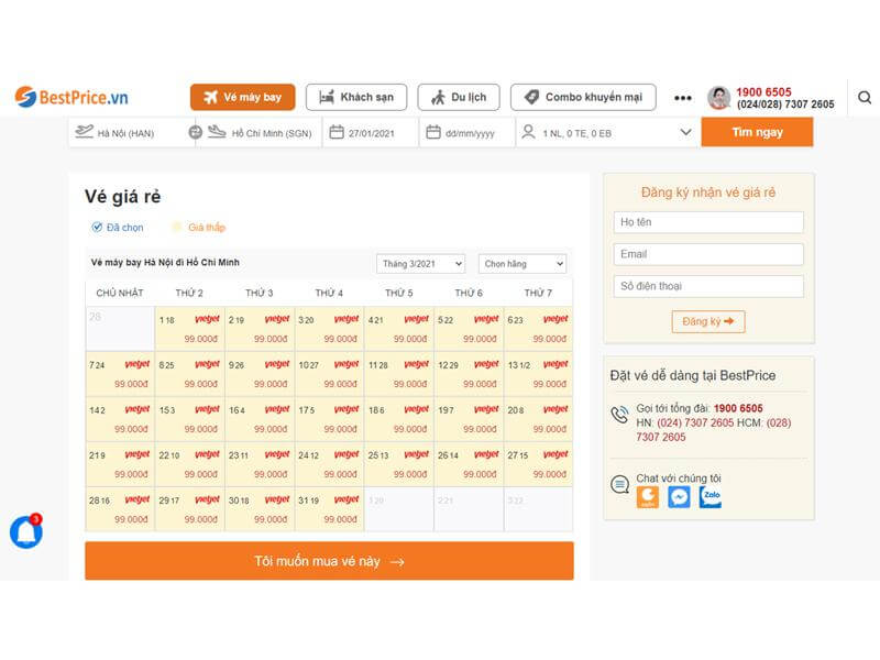 Ngay khi đó, hệ thống sẽ hiển thị bảng giá vé rẻ nhất trong tháng đi Hồ Chí Minh giúp bạn thuận tiện so sánh mức giá vé của các hãng và chọn cho mình ngày có giá rẻ ưng ý nhất. Khi chọn được rồi thì bạn click “Tôi muốn mua vé này” và thao tác các bước đặt vé sau đó cho tới khi hoàn tất là xong.