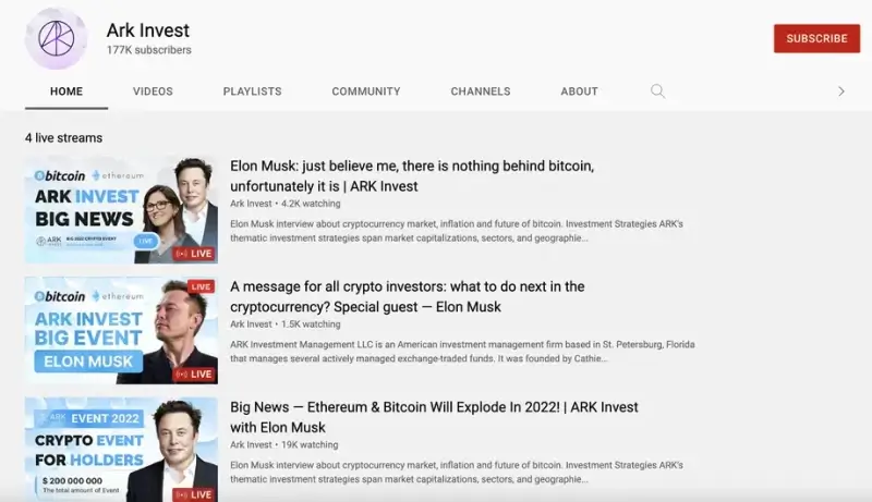 Những kẻ này cũng đã thay đổi tên và ảnh profile của kênh YouTube Quân đội Anh để nhìn giống như công ty đầu tư hợp pháp Ark Invest. Các hacker này cũng đã thay thế các video của kênh bằng một loạt các buổi livestream cũ với sự góp mặt của cựu Giám đốc điều hành Twitter Jack Dorsey và Giám đốc điều hành Tesla Elon Musk. Các buổi phát trực tiếp này đã từng được phát sóng trong khuôn khổ hội nghị The B Word do Ark Invest tổ chức vào tháng 6 năm ngoái. Bọn chúng đã thêm vào đó quảng cáo khuyến khích người dùng tham gia vào một trò lừa đảo cryto. Kênh này đã phát bốn buổi livetream cùng một lúc, thu hút tới hàng nghìn người xem.