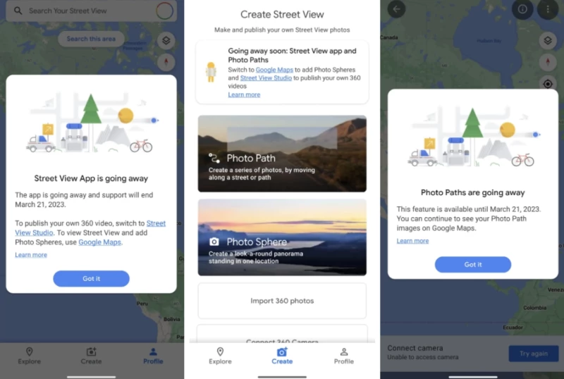 Ứng dụng Google Street View dành cho Android và iOS sẽ ngừng hoạt động vào đầu năm tới và sẽ bị xóa khỏi cửa hàng ứng dụng trong những tuần tới. Người phát ngôn của Google đã xác nhận rằng ứng dụng sẽ ngừng hoạt động kể từ tháng 3 năm 2023.