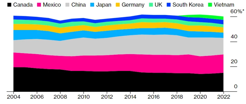 Khi các công ty Mỹ tìm kiếm các nhà cung cấp bên ngoài Trung Quốc trong cuộc chiến thương mại giữa Bắc Kinh và Washington, tỷ trọng thương mại của Mỹ với các nước như Mexico và Việt Nam đã tăng lên.