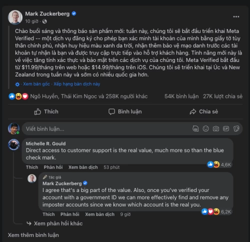 Mark Zuckerberg vừa thông báo rằng dịch vụ xác minh tài khoản tích xanh trên Facebook sẽ có giá là 12 USD/tháng trên phiên bản Website và 15 USD/tháng trên iOS. Dịch vụ này sẽ được triển khai trong tuần này tại Úc và New Zealand, sau đó sẽ mở rộng sang các quốc gia khác.