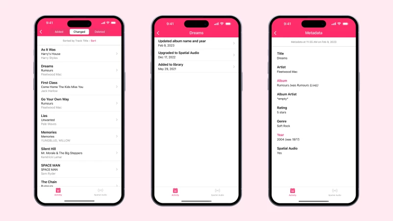 Với người dùng iOS, Music Library Tracker là một ứng dụng quen thuộc để theo dõi thư viện nhạc, cho biết album nào được thêm mới hoặc xóa đi. Gần đây, Music Library Tracker đã cập nhật thêm tính năng mới mang tên Spatial Audio Tracking, cho phép tự động cập nhật và hiển thị album nào trong thư viện nhạc của bạn đã được nâng cấp lên phiên bản Spatial Audio. Người dùng có thể tùy chọn nhận thông báo push hàng ngày và tự động tạo playlist gồm các tác phẩm có hỗ trợ Spatial Audio.