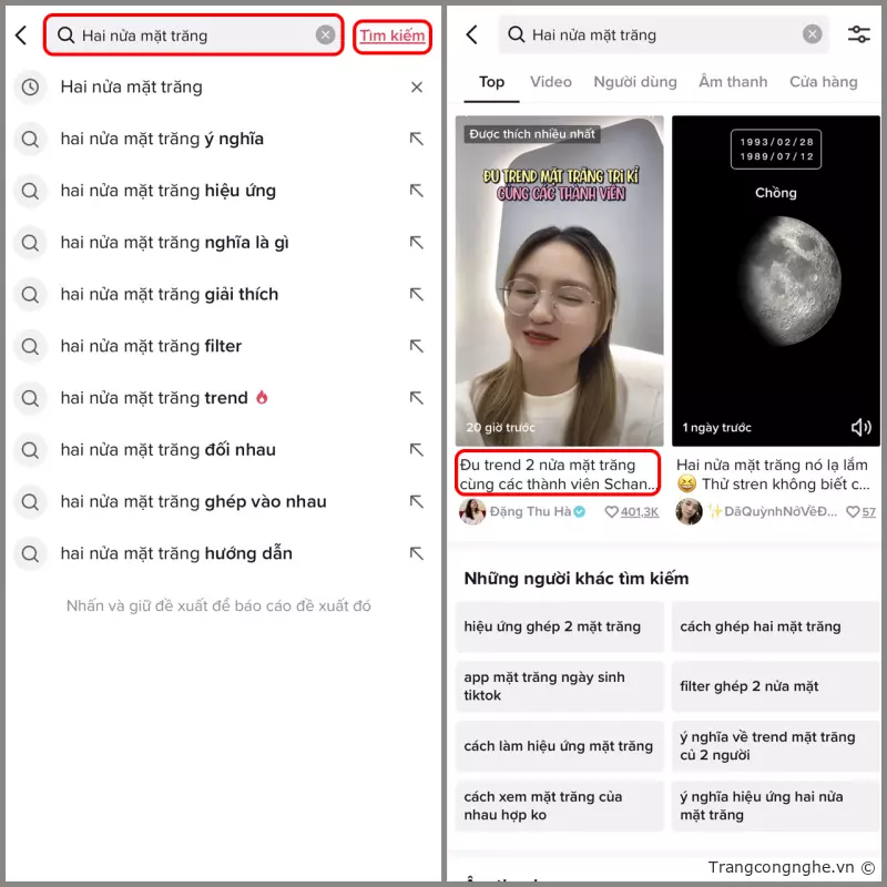 Bước 1: Mở ứng dụng TikTok > Nhấn vào thanh tìm kiếm > Nhập từ khóa 'Hai nửa mặt trăng' và bấm Tìm kiếm. Khi đó, màn hình sẽ hiển thị các video có hiệu ứng Hai nửa mặt trăng. Bạn chọn một video bất kỳ để làm mẫu.
