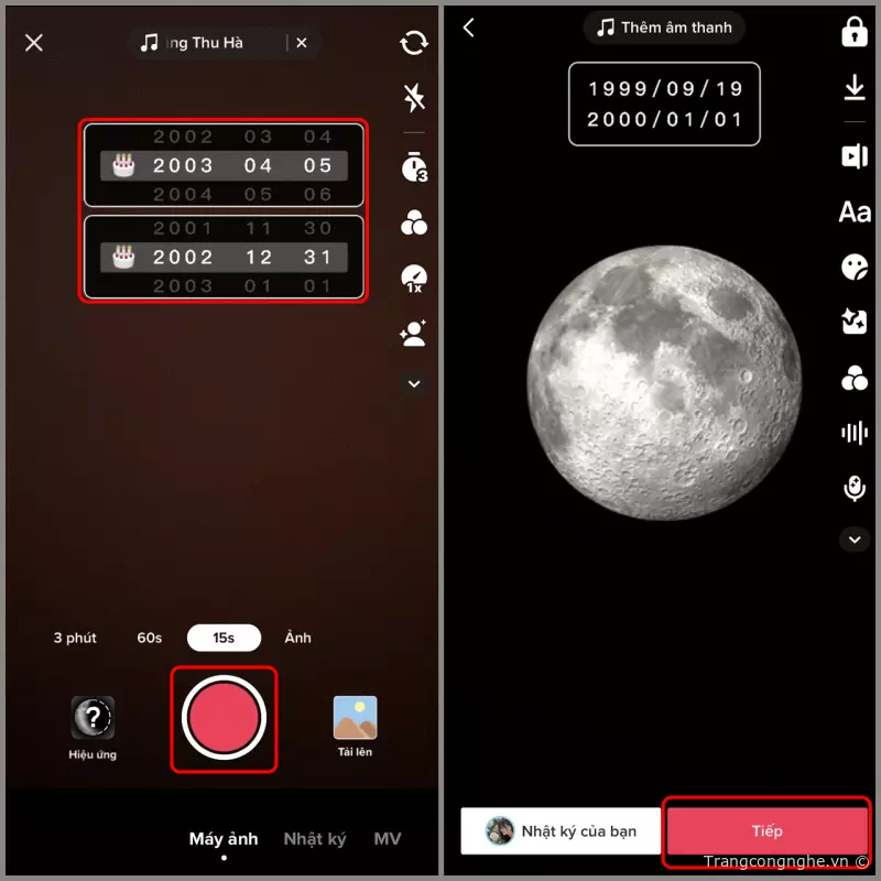 Bước 3: Sau khi chọn hiệu ứng Hai nửa mặt trăng, bạn cần nhập ngày sinh của mình và người kia vào phía dưới của màn hình. Sau đó, nhấn nút tròn đỏ để quay video trên TikTok. Khi đã quay xong, nhấn Tiếp để hoàn thành video và đăng lên tài khoản TikTok của bạn.